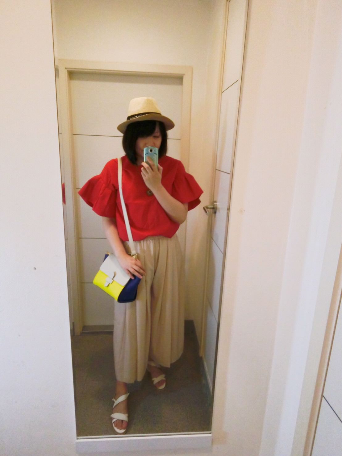 因為覺得袖子太寬蓬有點像魚鰓(?!)我就沒有拿它,但回頭看照片,覺得其實紅色的好好看啊!襯得膚色白,氣色不錯耶,搭白色的短褲或裙子應該都會很好看,是否該跟老闆追加(摸下巴)。