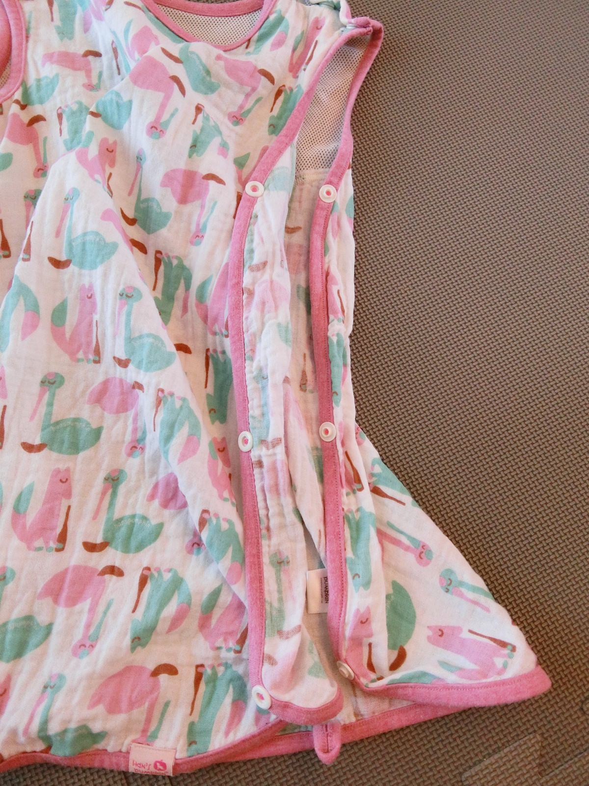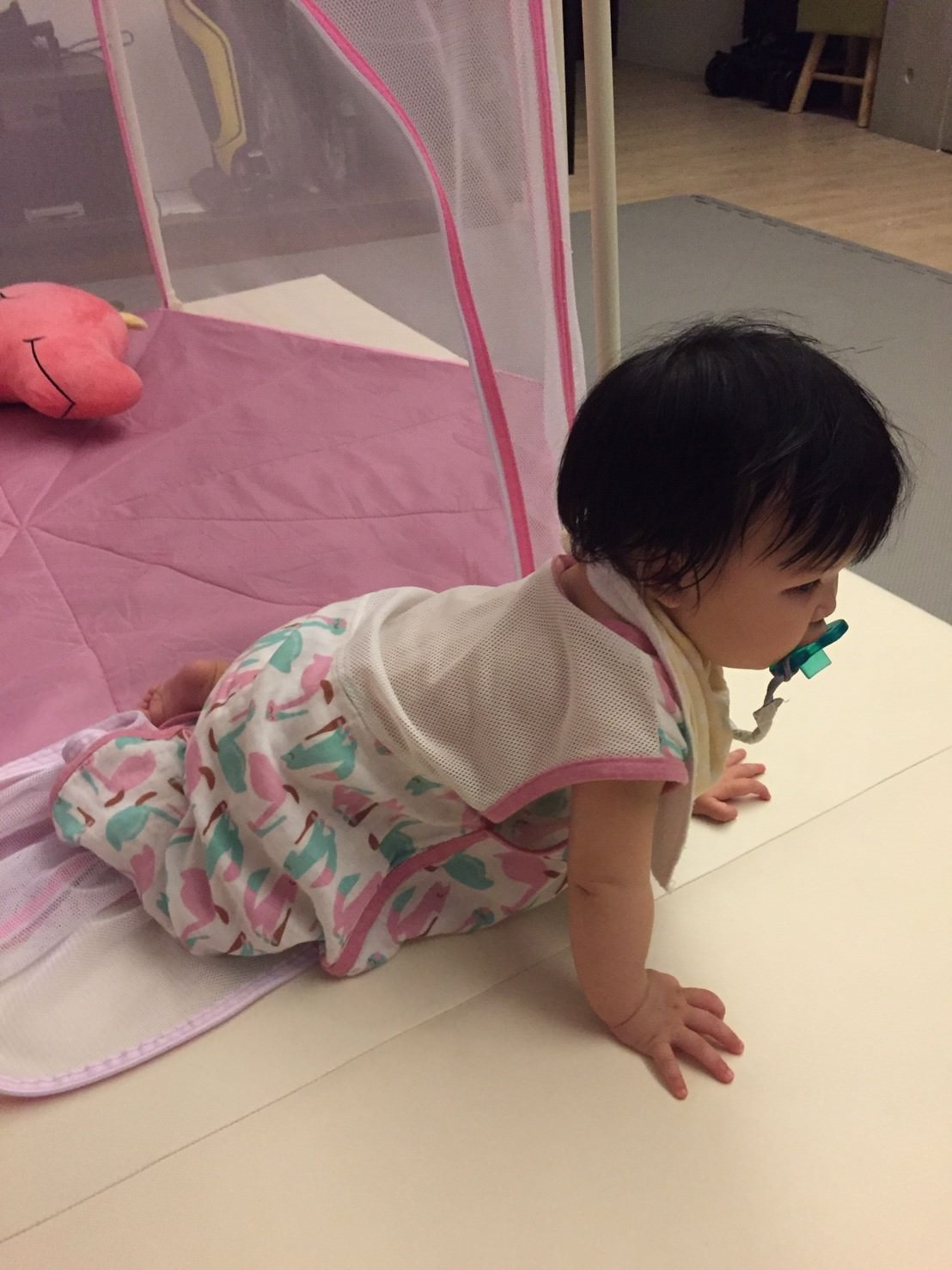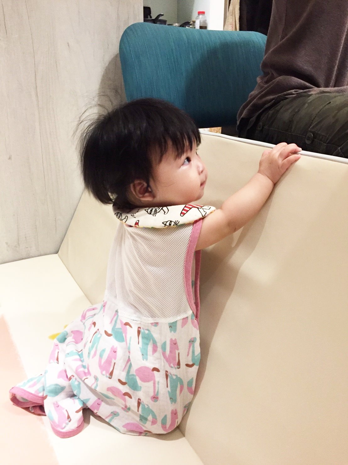 因為防踢被是單一尺寸,可以從0歲穿到5歲。嬰兒時期穿起來是有點大件像是睡袋,一歲以後穿起來會比較接近背心。對現在約8M大的軟Q而言雖然有點大件,但穿著爬行或扶站也沒啥問題。